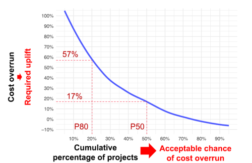 An example of a probability distribution is presented below, adapted from figure 1.3 of Reference Class Forecasting guidelines. Assuming our project is like those in the reference class, our project will sit in the middle of the distribution. This gives a 50 per cent probability (P50) that our project will overrun by 17 per cent or less. That means a 17 per cent budget uplift is needed to be 50 per cent sure that our project will not overrun. If this chance of overrun is too high for our risk appetite, we can calculate a more conservative budget uplift of 57 per cent. That will provide us with 80 per cent certainty (P80) that our project will not overrun.