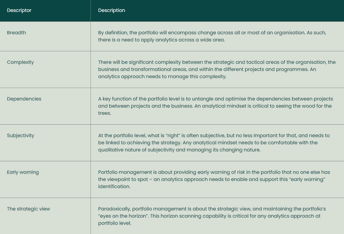 Analytics are therefore critical to allowing the good portfolio manager to understand what is going on across the large portfolio and support strong decision making with good data – a key element of building trust with the senior stakeholder community. But a) this is useless without excellent stakeholder skills that enable the portfolio manager to navigate the strong personalities and subjective nature of strategic alignment, and b) the nature of the analytics approach favours rapid analysis of a wide breadth of data rather than detailed analysis of specific depth of data – although, with improvements in data analytics techniques, might the advanced portfolio manager be able to both have their cake and eat it in a data sense?