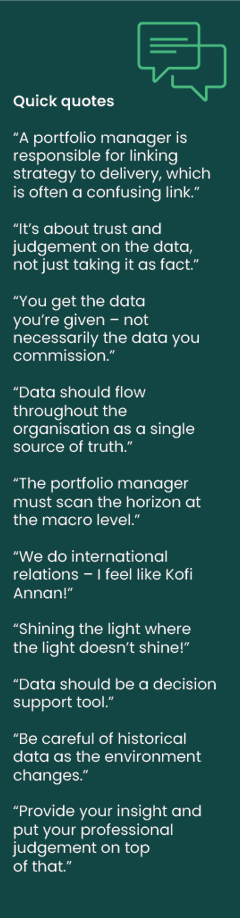 This would imply that, rather than simply trying to improve data in isolation around the portfolio board, if a portfolio manager wishes to use data as part of their arsenal, they should look to assess and improve their organisation’s cultural approach to data as an asset rather than as a blocker. To quote one of the participants: “Data should flow throughout the organisation as a single source of truth,” – therefore everyone should have an analytical mindset, with the varying levels of management focusing on different aspects of what the data is saying.