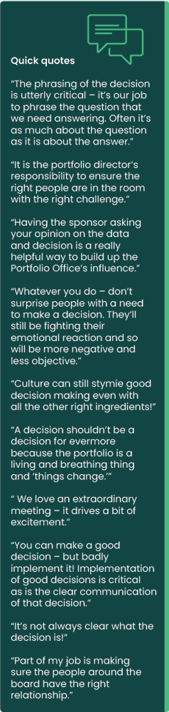 ‘A good decision is one taken in a timely and objective manner; using relevant data, made by appropriate and accountable decision makers and following the right challenge from relevant stakeholder for the right reasons.’ Many of the table would also add ‘underpinned by a strong recommendation from the portfolio director’. ‘There may be no right decision - but there's definitely a wrong decision!’ |