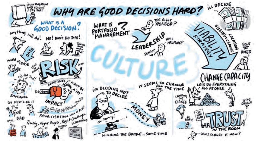 Firstly, is no decision worse than a bad decision? Or to put it another way ‘a good decision is a decision’. There were a number of comments identifying the importance of continuing to move forward and the damage caused by procrastination through delayed decision making. However a number of people also pointed out that, if the data was not there or the time was not right, then often the best decision is to consciously not make that decision. All sides did agree, though, that delaying decision making should be something done consciously as it can rapidly drain energy from a portfolio and render governance forums pointless.