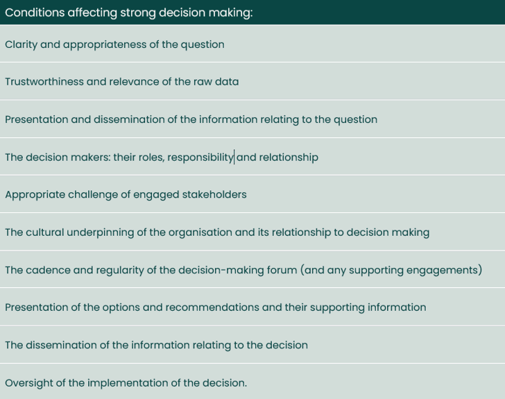 So, at the end of a long and detailed discussion, many of the attendees felt the main question they needed to answer was not ‘how do I get a good decision?’ but ‘how do I create the conditions and environment for good decision making?’ As a group we would summarise these conditions as: